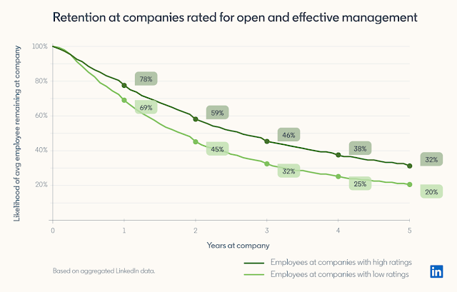 Все, кто имеет отношение к управлению талантами, много раз слышали этот трюизм: «Люди уходит не из компании; люди уходят от руководителя». Наши данные подтверждают эту прописную истину. LinkedIn иногда проводит исследования, в фокусе которых – взаимоотношения между сотрудниками и конкретной компанией. Мы попросили их проранжировать компанию по 14-ти ценностям, которые предлагает компания персоналу (employer value propositions (EVPs)), например, «гармоничный баланс работы и личной жизни» или «содержательная миссия».В полном соответствии с приведенным высказыванием, компании с самым высоким рейтингом (5%), которые характеризуются эффективным менеджментом, имеют высокие уровни удержания сотрудников. После 3-х лет сотрудничества с работодателем из этого списка вероятность, что сотрудник останется, составляет 48%. Для компаний, занимающих самые низкие позиции в рейтинге (5%) эта цифра составляет 32%.