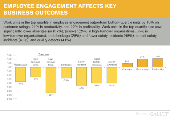 На изображении выше показаны различия между результатами работы и бизнесом: верхние 25% вовлеченности сотрудников по сравнению с нижними 25%. Это объясняет, почему HR уделяет столько внимания попыткам измерить и стимулировать вовлечение сотрудников.