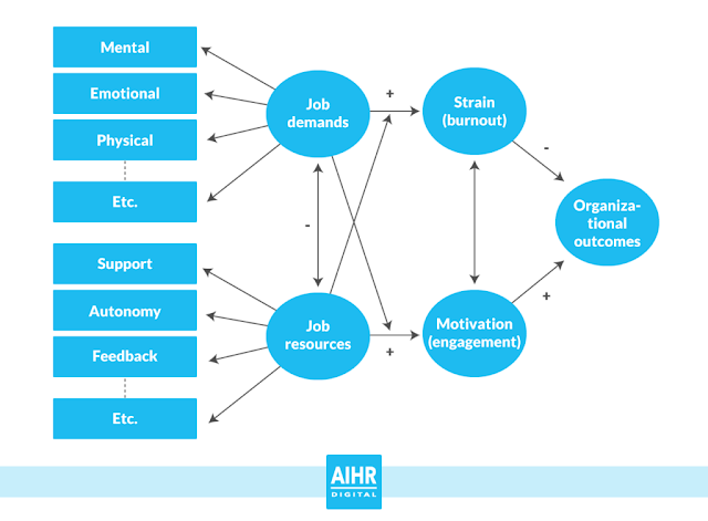 Модель показывает, что требования к работе приводят к нагрузке (и, в конечном итоге, к истощению), а ресурсы к работе — к мотивации (и, в конечном итоге, к вовлечению). Требования к работе определяются умственными, эмоциональными и физическими требованиями, на которые в основном влияют перегрузка и нехватка времени.