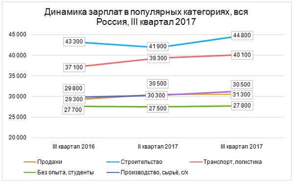 Больше всего по России выросла заработная плата строителей – на 7%, до 44 800 рублей. Динамика в категориях «Производство, сырье, c/х» и «Транспорт, логистика» составила 3% и 2% соответственно. Заработная плата студентов и специалистов по продажам практически не изменилась.