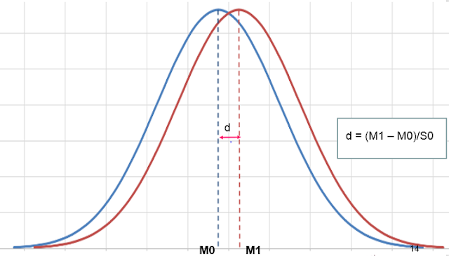 Как вы можете посчитать величину эффекта?Величина эффекта – это разница между до и после обучения. Например, у вас есть кто-то, кто не обучен (Т0). После обучения этого человека (Т1) вы ожидаете от него быть лучше в том, чему он был обучен. Значит, значение Т1 вырастет по сравнению с Т0 в измерении компетенций или языковом тесте.Чтобы проверить этот эффект, вы можете взять среднее значение обеих групп – Т0 и Т1. Вычитаете среднее значение Т0 из среднего значения Т1 и надеетесь, что разница положительная.Для стандартизации, вы делите ее на стандартное отклонение обработанного набора данных. Изображение ниже отображает размер эффекта от программы обучения.Как d (величина эффекта) вычисляется? Это всего лишь разница между средними значениями обученной ( красная кривая) и необученной (синяя кривая) групп в стандартном Z-score unit. Это может быть разница в средней производительности, времени принятия решений, изучениии т.д.