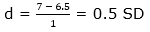 Но давайте вернемся к инспекторам по качеству в моей компании BeldenИх производительность была оценена на основе рабочего образца — это количество дефектов, обнаруженных в небольшом образце продукции с известным количеством (например, 10) ошибок.Прежположим, что средняя производительность  для обученной группы это 7, для необученной группы – 6,5, а стандартное отклонение производительности 1.0Размер эффекта может быть посчитан так .