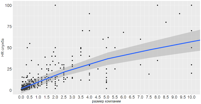 Также обратите внимание на большой разброс данных на диаграмме. Это говорит, что очень много факторов влияет на отношение численность работников к размеру HR службы.