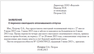 Ежегодный оплачиваемый отпуск нужно продлить или перенести, если работник в его период заболел и представил работодателю для оплаты листок нетрудоспособности. Новые даты отпуска компания определяет с учетом пожеланий сотрудника, которые он излагает в своем заявлении.