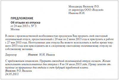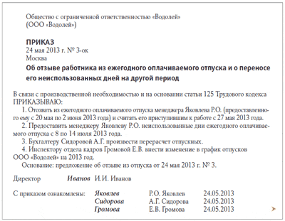 В этой ситуации нужно убедиться, что отзыв был сделан правильно. Отозвать работника из ежегодного оплачиваемого отпуска можно только с его согласия. Для этого работодателю следует сначала представить сотруднику предложение об отзыве из отпуска, получить его отметку на этом документе либо отдельное заявление о согласии, затем издать приказ и ознакомить с ним работника под роспись (ст. 125 ТК РФ). В этом случае неотгулянные дни отпуска должны быть предоставлены сотруднику по его желанию в любое удобное для него время. На основании указанных кадровых документов бухгалтер должен сделать перерасчет отпускных одним из способов, указанных в ситуации 1.