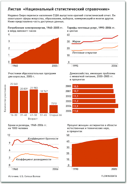 Это неплохая возможность представить всеобъемлющую картину страны. Вот уж действительно интересная штука. Некоторое время назад я перевел часть таблиц в диаграммы просто так, ради идеи. На рис. 0.4 вы можете увидеть динамику браков и разводов, почтовых тарифов, потребления электроэнергии и кое-чего еще. В первом варианте, то есть в таблице, разобраться в данных непросто, и все, что у вас получится извлечь из них, — это отдельные величины. А вот в графическом варианте вы легко можете заметить тенденции и паттерны и с одного взгляда провести сравнение.