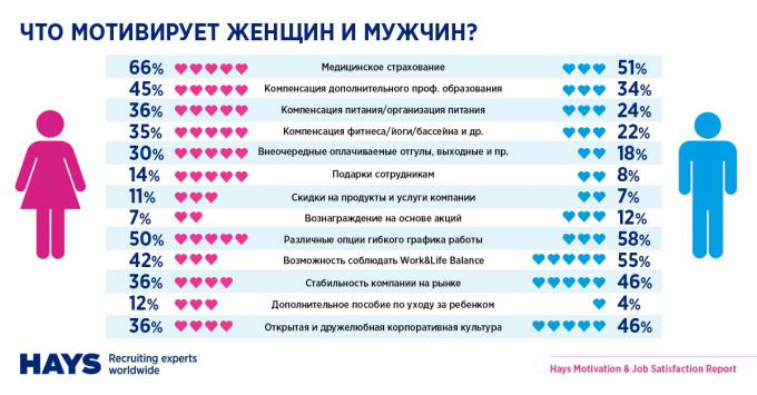 Исследование наглядно продемонстрировало, насколько разные взгляды на мотивацию имеют женщины и мужчины. Если среди женщин медицинское страхование является мотивирующим фактором для 66 % респондентов, то среди мужчин – для 51 %. Мужчины же выбирают различные опции гибкого графика – 58 % (женщины – 50 %) и возможность соблюдать баланс между работой и личной жизнью – 55 % (женщины – 42 %). Одним из важных факторов для респондентов-женщин стала компенсация дополнительного профессионального образования: ее выбрали 45 %, тогда как среди мужчин этот вариант упомянули только 34 %.