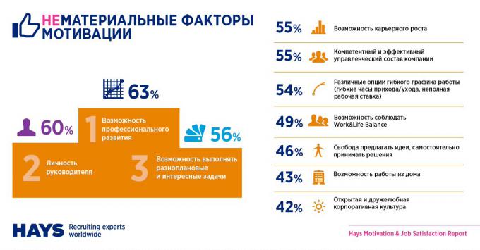 Также среди нематериальных факторов собственной мотивации 60 % профессионалов отметили личность руководителя, 56 % – возможность выполнять разноплановые и интересные задачи, по 55 % – компетентный и эффективный управленческий состав и возможность карьерного роста, а 54 % – различные опции гибкого графика работы.