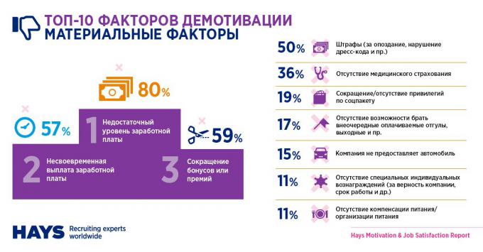 При анализе мотивационных факторов сразу видна разница между тем, чего хотят кандидаты, и тем, что готовы предложить работодатели. В то время как 93 % профессионалов назвали основным фактором материальной мотивации достойное денежное вознаграждение, предложить его готовы только 85 % работодателей. Бонусы за выполнение поставленных целей предлагают 82 % компаний, но они мотивируют лишь 66 % работников, а предлагаемое 41 % работодателей страхование жизни важным для себя мотиватором назвали лишь 18 % сотрудников.