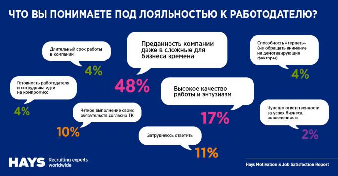 17 % работников называют лояльностью высокое качество работы и энтузиазм, 10 % – четкое выполнение своих обязательств. Только 4 % респондентов отметили длительный срок работы в компании, тогда как среди работодателей этот фактор считают показателем лояльности 8 %.