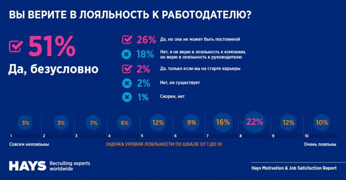 Исследование показывает, что 51 % профессионалов верят в существование лояльности к работодателю, 26 % считают, что лояльность не может быть постоянной, а 18 % верят в лояльность к руководителю, а не к компании.