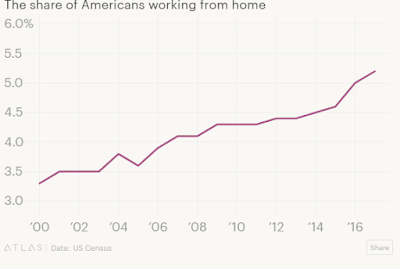 Подходы к выполнению работы быстро меняются, а эффективные способы коммуникации и больше возможностей означают, что некоторые компании предпочитают вообще избегать офисов типа open space. Количество людей, работающих из дома и публичных мест, таких как кафе и библиотеки, растёт. Как видно из графика, более 5% американцев работают из дома и по прогнозам это число будет увеличиваться в ближайшие годы, хотя и с малого числа.