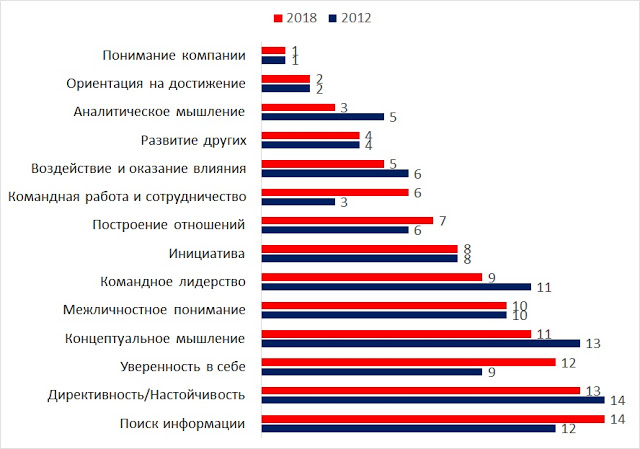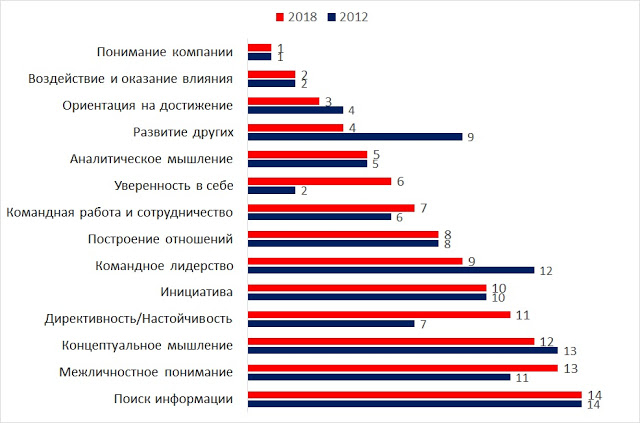 Т.е. беглый взгляд показывает, что изменения не очень заметные. Аналитическое мышление с пятого места в 2012 году поднялось на третье место — это (?) дань моде на аналитику, которую подметили HR-директора и стали замечать эту компетенцию у себя чаще.