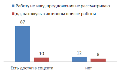 На диаграмме распределение ответов на вопросы о наличии доступа в социальные сети и вопроса «Рассматриваете ли вы предложения о работе?»
