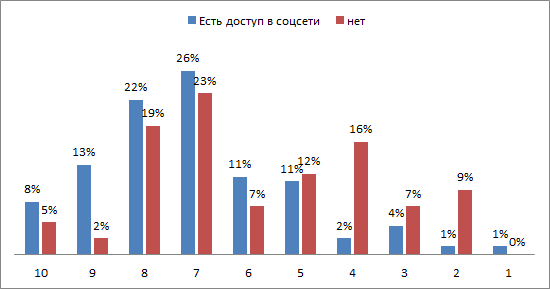 На диаграмме распределение ответов на вопросы о наличии доступа в социальные сети и вопроса «Оцените общую удовлетворенность работы в компании (1 – минимальная степень удовлетворенности; 10 – максимальная степень удовлетворенности)»