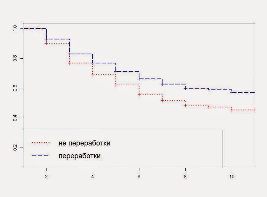 И для первых тогда коэффициент регрессии должен быть положительным, а для вторых — отрицательным — снижающим срок жизни в компании.У нас нет возможности вычислить мотивированных и не мотивированных, поэтому я придумал простой ход. Он спорный, но за неимением лучшего смотрите.Я, как указывал ранее, брал только тех, кто устроился на работу в 2014 году. Те, кто за это время не уволился, можно считать мотивированными, а тех, кто успел устроиться на работу и уволиться же — немотивированными. (Условно говоря!!!)
