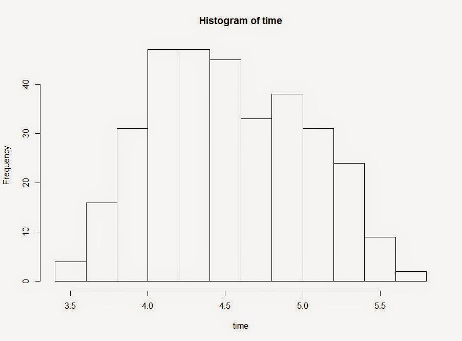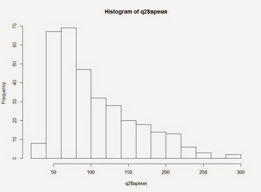 По оси X — время работы в компании в днях.Данные Min. 1st Qu.  Median    Mean 3rd Qu.    Max.    34.0    62.0    89.0   104.7   136.0   285.0 И здесь замечу, что я брал только тех, кто отработал не менее 30 дней в компании, чтобы наличие / отсутствие переработок искажалось тем фактом, что человек уволился до того, как успел дожить до этих переработок.Чтобы построить линейную регрессию, логарифмируем стаж и получаем вот такое распределение.
