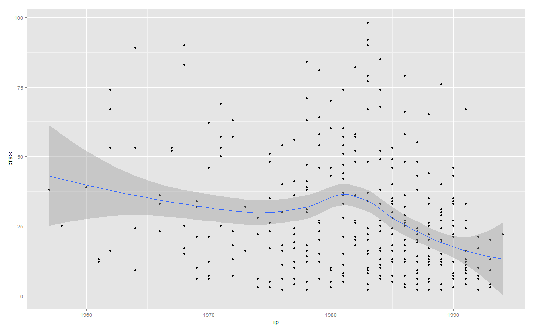 Заметно, что в районе начала 80-х есть горб, который говорит, что люди этого возраста работают в компаниях дольше. По логике линия тренда должна быть прямой вниз слева направо. Однако выделяется этот горб.