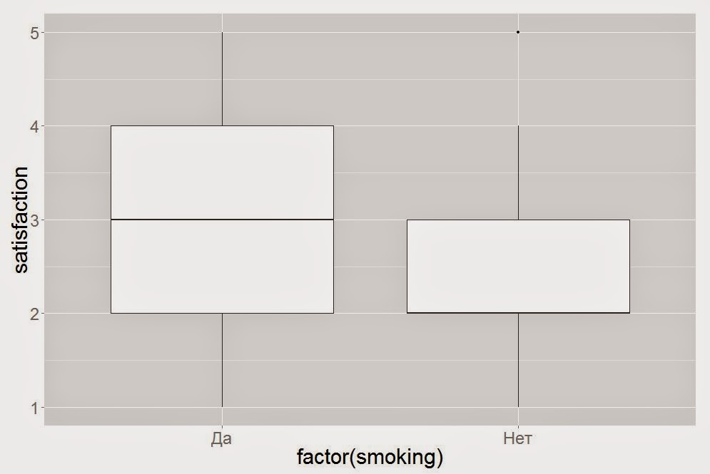 data: satisfactionjob by smokingW = 6385937, p-value = 2.146e-06alternative hypothesis: true location shift is not equal to 0Для тех, кто не умеет читать данные записи — посещайте семинар Аналитика для HR