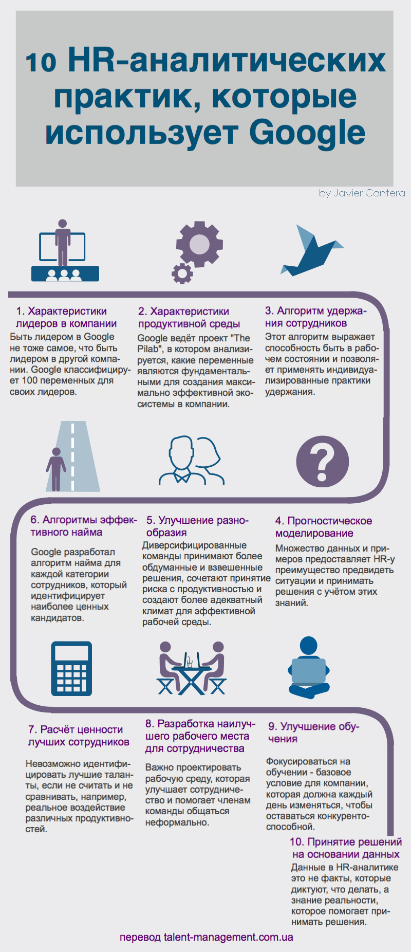 Статья “How Google using people analytics to completely reinvent HR” (“Как Google использует аналитику, чтобы полностью переизобрести HR”), может помочь нам больше узнать об эффективном применении данных и аналитики в HR. Салливан говорит о важности строгости в принятии решений о людях — те, кто уже много лет в HR, знают, что это большой вызов для нашей профессии. Решения, основанные на неполных данных, впечатлениях за кофе, искаженных оценках и благих, но ошибочных намерениях, были нашим обычным способом работы. Теперь у нас есть возможность использовать инструменты и методы, чтобы научно обосновать наши мнения. Речь идет о внесении вклада в принятие правильных решений о людях.
