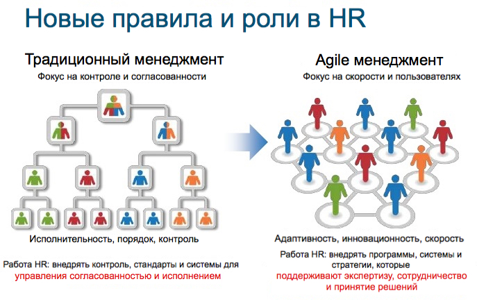 С Agile HR традиционная ориентация на контроль и согласованность сместилась к более гибкой ориентации на скорость реагирования и пользователей.